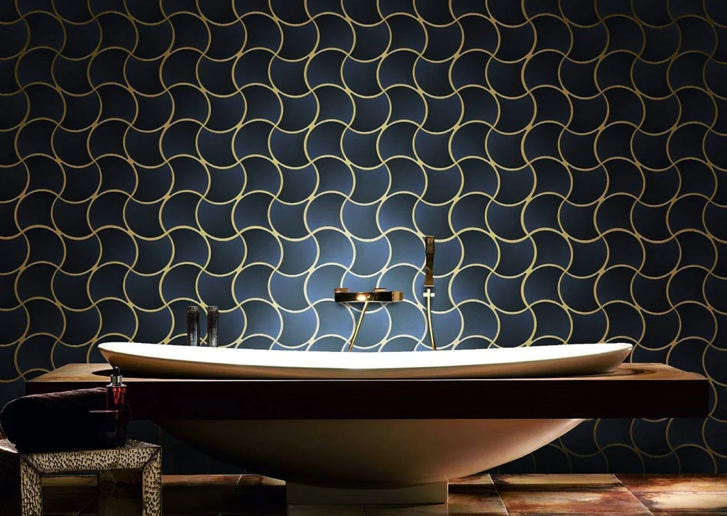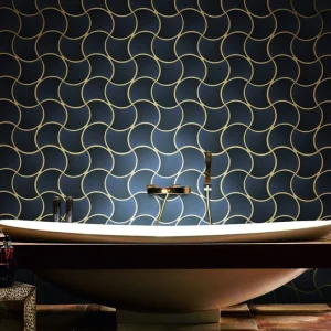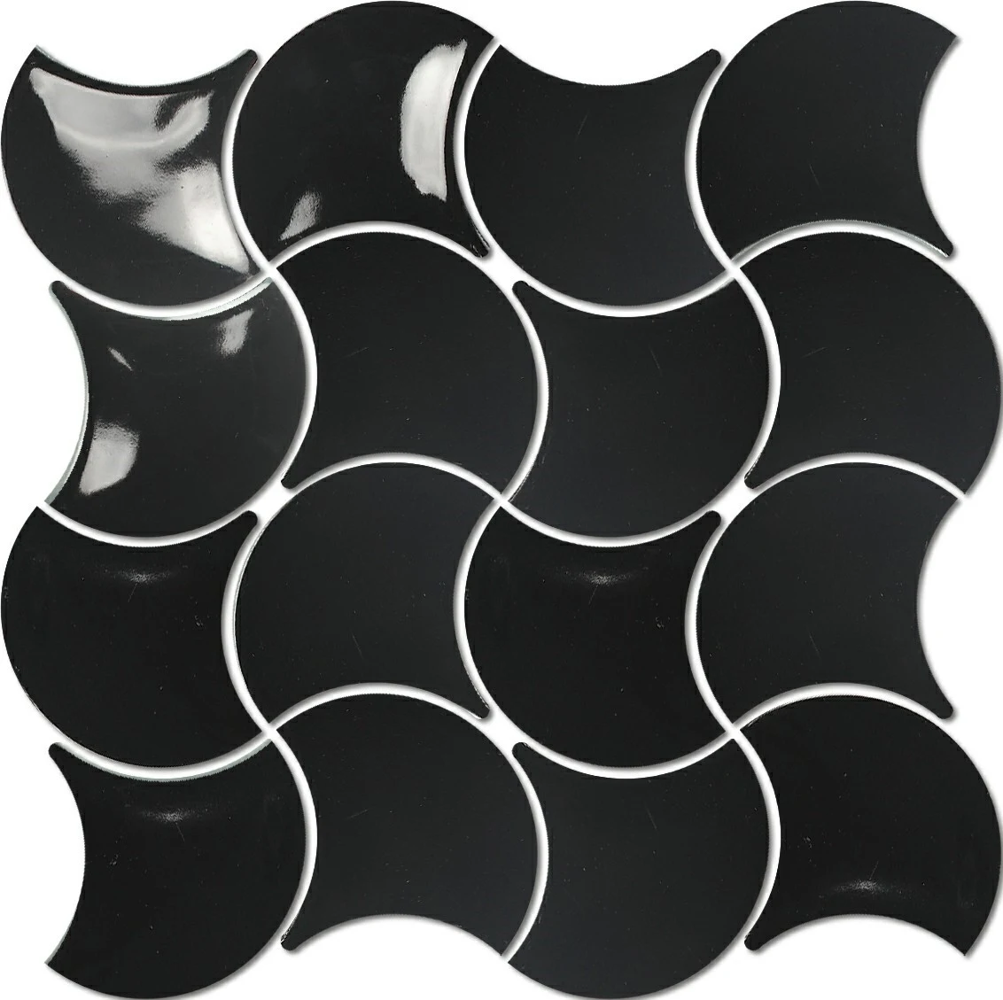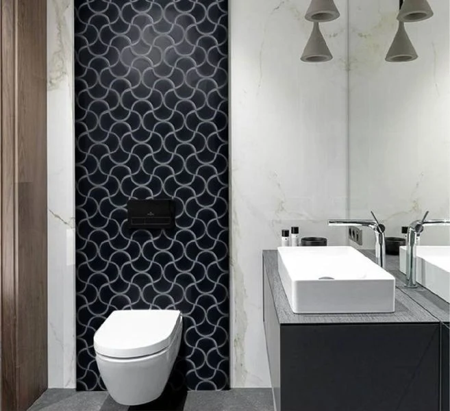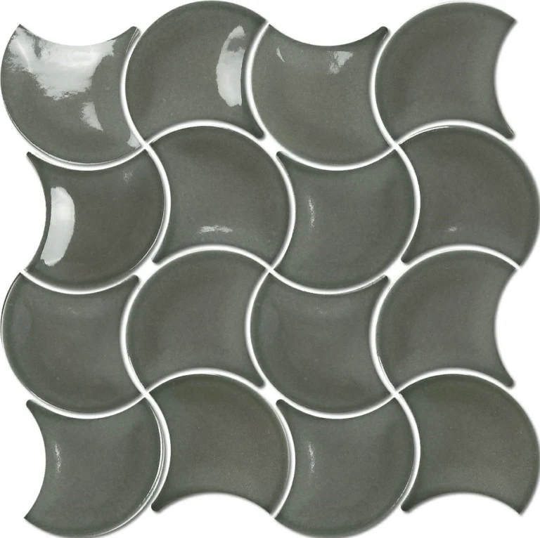 鉑黑色的亮面處理,賦予這款葉形磁磚一種如黑曜石般的神秘張力。每一片磁磚的交織都像是一場幾何與流線的對話,在深沉的底色中透過高亮度反射,呈現出極具現代感的都會時尚氣息。