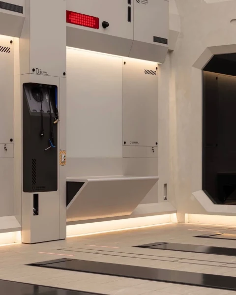 #希悅設計 將未來的想像實體化,運用純白語彙與大量金屬折射,在牆面上鋪陳出一種近乎真空的純粹。那些精密排列的線型燈帶,與牆面上的 01、02、03 編號相互呼應,共同構築了如同太空艙般的沈浸感。